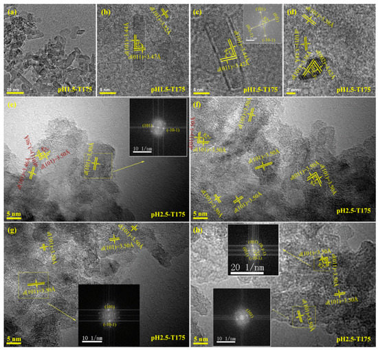 Figure 5a depicts a TEM image of the pH1.5-T175 nanocrystals derived from microwave-assisted hydrothermal treatment of the exfoliated H2TiO3 nanosheet colloidal solution at 175 °C with a reaction time of 2 h. As shown, a large number of rod-shaped nanocrystals with a size of about 10–30 nm and a small number of rhombic nanocrystals with a size of ~10 nm were observed. The corresponding high-resolution TEM (HRTEM) images (Figure 5b,c) showed unparallel (101) and (011) atomic planes of the rod-shaped nanocrystals with a lattice spacing of 3.44 and 3.47 Å (or 3.42 Å), respectively, and an interfacial angle of 82°, which matches well with the theoretical value for the angle between the {101} and {011} facets of anatase TiO2 nanocrystals [14]. Therefore, the dominant exposed crystal plane of the pH1.5-T175 nanocrystals was perpendicular to the above {101} and {011} crystal facets, i.e., the crystal plane was vertical to the [111] crystal zone axis. Since the crystal plane perpendicular to the {101} and {011} crystal facets was uncertain, for convenience, we express it as an [111] facet. The exposed rod-shaped nanocrystal [111] crystal facet could be further confirmed through a fast-Fourier-transform (FFT) diffraction pattern (Figure 5c inset). It should be noted that the [111] facet was different from the {111} facet, because anatase belongs to a tetragonal system, not a cubic system. In a cubic crystal system, the crystal plane perpendicular to [111] the crystal zone axis is the {111} facet. According to the above analysis, the rod-shaped nanocrystals co-exposed in the crystal planes were [111] facets and {101} facets, i.e., {101}/[111] facets. Figure 5d shows the unparallel (101) and (002) planes of the rhombic nanocrystals with a lattice spacing of 3.38 and 4.62 Å, respectively. Moreover, the interfacial angle of ca. 68.3° between the aforementioned atomic planes also matches well with the theoretical value of anatase TiO2 nanocrystals [15,44]. Therefore, the above rhombic nanocrystal was confirmed to be anatase TiO2 with dominant {010} facets on the two basal surfaces and {101} facets on the four lateral surfaces. Figure 5e–h presents HRTEM images of pH2.5-T175. As shown, nanocrystals with short rod-shaped, square-prism-shaped, and some irregular morphology were observed. Along the [111] zone axis, the HRTEM image in Figure 5e,f,h displays (101) and (011) crystal facets of the rod-shaped (or square-prism-shaped) nanocrystal with an interfacial angle of 82°, which is in good agreement with the theoretic value. Therefore, the above rod-shaped and square-prism-shaped anatase TiO2 nanocrystals co-exposed {101}/[111] facets. Furthermore, lattice fringes with a spacing of 3.50 Å could be assigned to the {101} facets of the irregularly shaped anatase nanoparticles. The FFT diffraction pattern of the yellow dashed lines region (Figure 5e,g,h inset) further indicated that the rod-shaped, square-prism-shaped, and irregular TiO2 nanocrystals were single-crystalline.