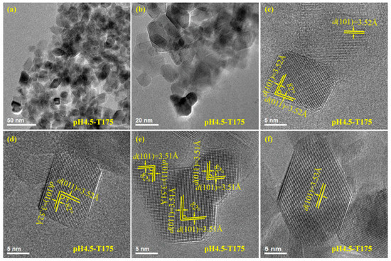 As shown in Figure 6a,b, the synthesized pH4.5-T175 nanocrystals (anatase phase) mainly had two morphologies, a square prism and a rhombus. Moreover, a small number of anatase nanocrystals with irregular morphologies were also observed in the above sample. Figure 6c,d shows an HRTEM image of typical square-prism-shaped anatase TiO2 nanocrystals. The lattice fringes of 3.52 and 3.52 Å corresponded to {101} and {011} lattice spacing, respectively, and the angle of 82° measured between the {101} and {011} facets matched closely with the theoretical value, corroborating that the exposed crystal facets were [111] facets and {101} facets (or {011} facets) on the two basal surfaces and the four lateral surfaces of the square-prism-shaped anatase TiO2 nanocrystals, respectively. According to the above discussion, the irregular anatase TiO2 nanocrystals in Figure 6e co-exposing the crystal facets were also {101}/[111] facets. The lattice fringes with spacing of 3.51 Å could be assigned to the {101} facet of the approximately rhombic anatase TiO2 nanocrystal (Figure 6f), which was parallel to the lateral surface, indicating that the lateral surface had exposed {101} facets.