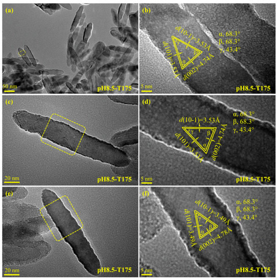 The well-defined nanospindle structure (with a particle size of about 70–140 × 17–35 nm2) of the pH8.5-T175 sample was further confirmed by the TEM image, as shown in Figure 8a. Two magnified TEM images of the uniform anatase nanospindles are presented in Figure 8c,e. Figure 8b,d,f shows HRTEM images marked from the yellow dotted frame area indicated in Figure 8a,c,e, respectively. There were three types of lattice with fringe spacing of 3.53, 4.74, and 3.53 Å (or 3.49, 4.78, and 3.49 Å) and interfacial angles of 68.3°, 68.3°, and 43.4°, which agreed well with the (101), (002), and (10−1) lattice planes of anatase TiO2. The {001} facets were perpendicular to the long axis (c axis) direction and parallel to the transverse axis (b axis) direction of the spindle-shaped nanocrystal, respectively, indicating the oriented growth of spindle-shaped nanocrystals in the [001] crystallographic direction. Therefore, the exposed lattice facets of the nanospindles were mainly {010} facets (based on the HRTEM analysis).