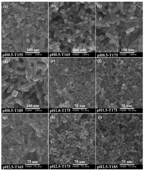 FESEM images of TiO2 nanocrystals synthesized under different pH values and temperatures: (a) pH0.5-T155, (b) pH0.5-T165, (c) pH0.5-T175, (d) pH0.5-T185, (e) pH1.0-T175, (f) pH1.5-T175, (g) pH2.5-T165, (h) pH2.5-T175, and (i) pH2.5-T185.