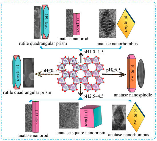 The growth of the rutile-type and anatase-type TiO2 nuclei along the different crystallographic directions caused the formation of a rutile quadrangular prism, an anatase nanorod, an anatase nanorhombus, an anatase square nanoprism, and an anatase nanospindle. As shown in Figure 11, a rutile quadrangular prism with exposed {110} facets on the four lateral surfaces was formed by the directional growth of the rutile-type TiO2 nuclei along the [001] crystallographic direction under strong acidic conditions (pH = 0.5, 1.0). An anatase nanorod (or square nanoprism) with co-exposed {101}/[111] facets was formed by the directional growth of the anatase-type TiO2 nuclei along the [101] and [011] crystallographic directions, and an anatase nanorhombus with dominant exposed {010} facets was formed by the directional growth of the nuclei of anatase-type TiO2 along the [101] and [001] crystallographic directions at relatively low pH values (1.0 ≤ pH ≤ 4.5). At pH ≥ 6.5, an anatase nanospindle with dominant exposed {010} facets was formed by the directional growth of the nuclei of anatase-type TiO2 along the [001] crystallographic direction.