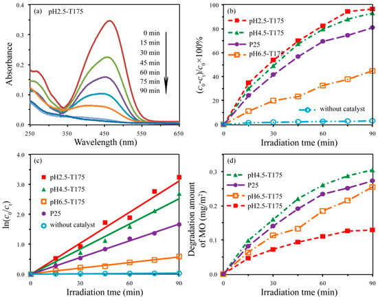 Figure 12b shows the evolution of the photodegradation rate along with the irradiation time. It can be noticed that the pH2.5-T175 nanocrystal showed the highest decomposition efficiency among all the tested samples, reaching above 96.5% under UV irradiation for 90 min. The second fastest decomposition efficiency was obtained with the pH4.5-T175 nanocrystal, where 93.3% of MO was decomposed after 90 min of UV light irradiation. The order of decomposition efficiency observed for MO degradation in the other samples was P25 (81.1%) > pH6.5-T175 (44.7%) > blank sample (3.1%). In order to have a quantitative comparison of the decomposition efficiency of the above samples, the experimental data in Figure 12b were fitted according to the pseudo-first-order kinetic process, which can be expressed as follows [50]: