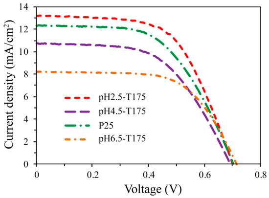Current–voltage characteristic curves of dye-sensitized solar cells (DSSCs) fabricated using pH2.5-T175, pH4.5-T175, pH6.5-T175, and P25 samples.