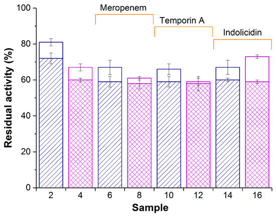 Enzymatic activity of composite biomaterials PVA-CG/His6-OPH (samples 2,6,10, and 14) and PVA-CG/BC/His6-OPH (samples 4,8,12, and 16) in the absence (samples 2 and 4) or in the presence of meropenem (samples 6 and 8), temporin A (samples 10 and 12), and indolicidin (samples 14 and 16). White and patterned bars represent activity at zero time and after 24 h, respectively. The same samples prepared without His6-OPH were used as controls and had no measurable hydrolase activity. Initial activity of free His6-OPH was accepted as 100%.