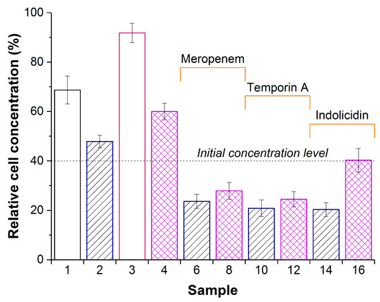 Concentration of Pseudomonas sp. in a suspension after 24 h exposure with PVA-CG (sample 1), PVA-CG/His6-OPH (samples 2,6,10, and 14), PVA-CG/BC (sample 3), or PVA-CG/BC/His6-OPH (samples 4,8,12, and 16) in the absence (samples 1,2,3, and 4) or in the presence of meropenem (samples 6 and 8), temporin A (samples 10 and 12), or indolicidin (samples 14 and 16). The dashed line indicates the cell concentration at zero time. Concentration of cells in the control without any additions after 24 h was assumed as 100%. Cultures treated by composite samples without His6-OPH but with antimicrobial agents for 24 h had almost the same bacterial concentration as the initial level.