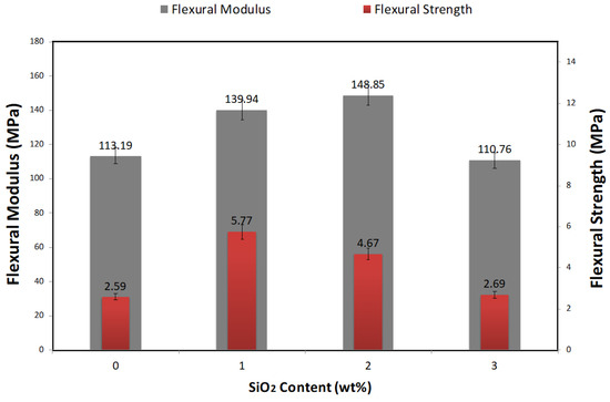 Variation of flexural modulus and flexural strength of all composites as a function of nanosilica contents.