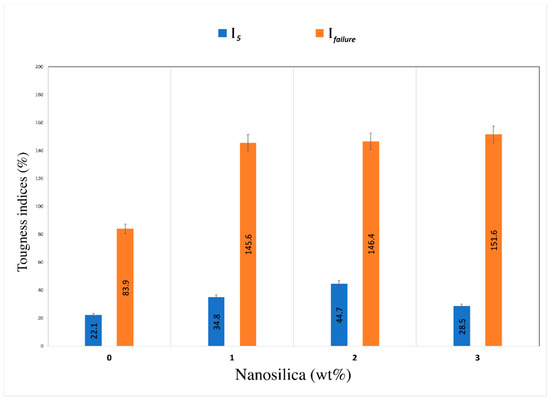 By studying the composite toughness, the previous findings on this could be ascertained. The load–midspan deflection for all composites is shown in Figure 4. The toughness index I5, by definition, is the ratio between the area of triple the initial fracture deflection to the initial fracture deflection, whilst Ifailure can be calculated at 4.5 mm deflection for every specimen toughened with PVA fibers. All composites displayed proper stiffness because of the capacity of PVA to bridge the cracks and bear greater load, which overcame the issue of brittleness and sudden failure of the geopolymer. However, the addition of nanosilica particles showed remarkable variations on the results of flexural toughness. Figure 5 shows the results of toughness indices as calculated from the load–midspan deflection curves of all composites. Composites containing 1.0, 2.0, and 3.0 wt% NS displayed enhancement of 50–100% in I5 toughness indices and 70–80% in the Ifailure toughness indices compared to the PVA-FRGC without nanosilica. Amongst composites with various quantities of NS, the composite with 1.0 wt% was found to display the maximum strength. However, the load–midspan deflection curve showed higher rate of load reduction with an increase in deflection beyond the peak load of 660 kN, which may be attributed to the fiber fracture effect. In contrast, composites with 2.0 wt% exhibited lower strength but slower reduction in load beyond the peak load point. This may be due to the fiber pull-out effect as the adhesion between the geopolymer matrix and PVA fibers was lower compared to the composite with 1.0 wt% nanosilica. It seems from the above results that, at nanosilica content of 1.0 wt%, its dispersion was much better than the other two nanosilica contents, resulting in higher flexural behavior of the PVA fiber-reinforced geopolymer composite.