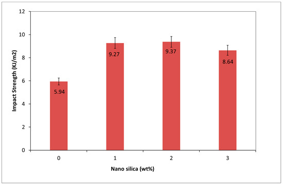 The aptitude of the matter to endure force is referred to as the impact strength. The effect of NS addition on impact strength possessed by PVA-FRGC is shown in Figure 6. It can clearly be seen that the presence of NS significantly improved the impact strength of PVA-FRGC beyond the optimum content. The impact strength of PVA-FRGC containing 1.0 and 2.0 wt% NS was increased by about 57–58% compared to PVA-FRGC without NS. The addition of 3.0 wt% NS in the composite, on the other hand, deviated this trend slightly. This reduction in impact strength was linked to the poor dispersion of NS into the geopolymer matrix due to agglomeration. This led to poor bond between the matrix and the PVA fibers.