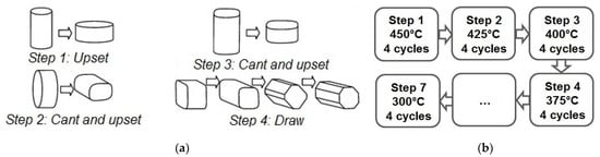 We used a commercial magnesium alloy WE43 containing, according to chemical analysis, 3.56% Y, 2.20% Nd, and 0.47% Zr (wt%) as a material for study. The cast alloy was homogenized at 525 °C for 8 h, then extruded at 430 °C with an extrusion ratio of 6.6 to give the work piece the desired shape and annealed again at 525 °C for 8 h. This was followed by air cooling. The cooling rate was sufficient to obtain a supersaturated solid solution in this alloy. Henceforth, the state of the alloy after this treatment will be referred to as the initial state. Multiaxial deformation was carried out on cylindrical specimens with a diameter of 25 mm and a length of 40 mm in multiple (up to 28) passes. This corresponds to a cumulative equivalent true strain of 17.5. This was accompanied with a step-wise decrease in the processing temperature from 450 °C to 300 °C (Figure 1). The deformation was carried out on an Instron 300LX (Instron, High Wycombe, UK) universal hydraulic static testing machine with a deformation rate of 2 mm/min.