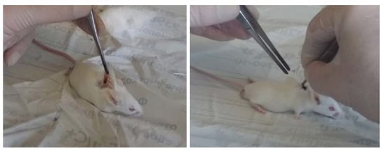 For in vivo assays, 12 male mice of Balb/c line (with a weight of 20 ± 2 g), divided into two groups (six animals per group), were used as biological objects. The alloy plates used for implantation had the dimensions of 10 × 5 × 0.3 mm. As in the in vitro studies, prior to the tests the samples were sterilized with 70° ethanol for 18 h and then dried under sterile conditions. They were implanted subcutaneously into the back of the mice (one sample per one animal). The edges of the wound were sutured using surgical silk (Figure 2). The mice were maintained under standard conventional conditions (housed in polycarbonate cages, food and water ad libitum, an air temperature of 20 ± 2 °C) before the experiment and during the entire observation period.