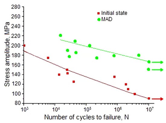 As mentioned in the Introduction, alloy WE43 is a promising candidate material for medical applications, notably in orthopedic implants. Such implants are exposed not only to static, but also to cyclic loads. To characterize the fatigue performance of the alloy in the initial and the UFG states, its fatigue limit was measured (for the number of cycles N = 107). It was shown that MAD-induced grain refinement, along with a significant increase in static strength, also led to an increase in the fatigue limit (σR), which rose from 90 to 165 MPa (Figure 4 and Table 1). It can be concluded that the proposed MAD treatment could significantly increase the ability of the material to resist cyclic loads. This property is especially important in orthopedic surgery, e.g. in screws for fixation of leg and rib fractures. In these cases implants experience cyclic loading during walking or breathing and sufficient fatigue strength is crucial for the structural integrity of the implant. To rationalize the MAD-induced enhancement of the fatigue strength of WE43, a well-established correlation between this quantity and the ultimate tensile strength [] can be invoked. Apparently, the increase of the latter (cf. Table 1), which is believed to be associated with grain refinement and, to a lesser extent, precipitation of Mg41Nd5 particles brought about the concomitant increment of the fatigue strength.