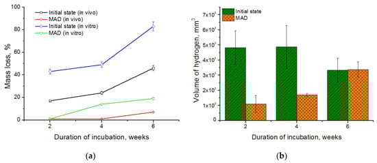 A comparison of the mass loss of the alloy in the initial and the UFG states measured under in vitro and in vivo conditions is presented in Figure 5a. In vivo studies showed that the biodegradation of the alloy in the UFG state proceeded much slower than in the initial state. Plates cut from the initial alloy fully deteriorated already two weeks after the beginning of the experiment. This rapid degradation of the alloy in the initial state was accompanied with the release of a significant amount of hydrogen gas, as reflected in its accumulation in the tissues surrounding the samples. The process of biodegradation of the alloy in the ultrafine grained state was much slower. A significant accumulation of hydrogen in tissues and erosion of the samples, especially at the edges, was observed over four weeks after implantation. The effect progressed with the implantation time. However, by the end of the observation period the changes in the morphology of the alloy samples after MAD were quite insignificant. Their shape was completely preserved, structural integrity was not lost, and only the color of the surface of the plates changed. The mass loss of the coarse grained alloy amounted to 46% of the initial mass after six weeks of implantation, while the mass loss of the UFG alloy was just 7%. At the same time, the data obtained demonstrates a significant acceleration of the degradation process of the alloy samples under in vitro compared with in vivo conditions, both for the initial and the deformed alloy. Under in vitro conditions, the coarse grained alloy lost almost half of its initial mass already after two weeks of incubation—as opposed to six weeks under in vivo conditions. The mass loss of the initial alloy was about 83% by the end of the experiment. These data are consistent with the results of the cited article [] where a comparative analysis of the biodegradation rate of homogenized alloy WE43 in bodily fluids in various conditions was presented. It was established that in vitro biodegradation in FBS was much faster, and was accompanied with a much vigorous gas formation, than in vivo.