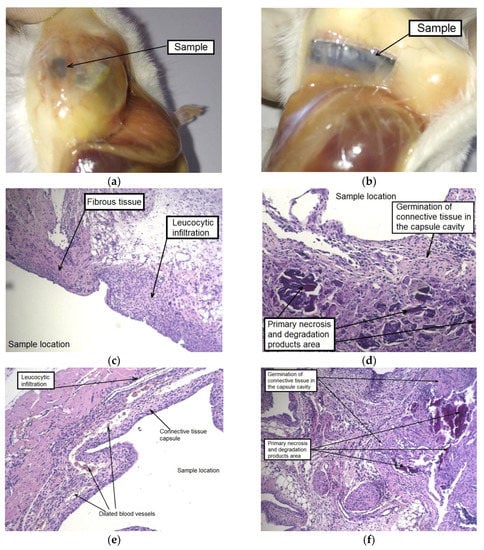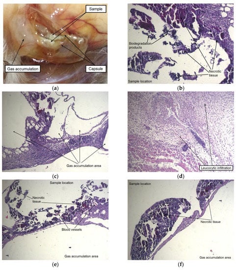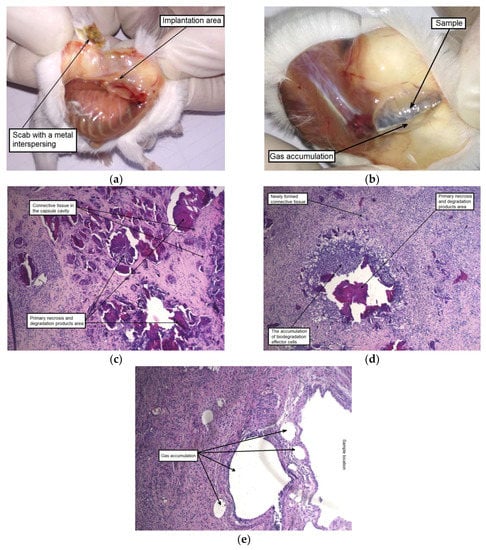 A histological examination of animal tissues after implantation of MAD-treated alloy samples revealed an accumulation of a significant amount of gas not only in the capsule cavity surrounding the sample, but also in its walls and the adjacent tissues, which were profusely permeated with histiocytes (Figure 9e). A significant amount of small isolated foci of the biodegradation products and necrotic tissue, surrounded by a cell bank and included in the newly formed fibrous connective tissue filling the volume of the cavity around the implant was also observed after six weeks. Thus, it could be concluded that recovery processes occurred once signs of active degradation and accompanying gas formation in animal tissues disappeared (Figure 9c,d).