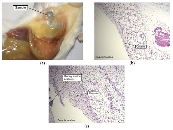 During the postoperative period, the biodegradation rate of the sample was monitored by measuring the volume of gas accumulated in the implantation area once every three days. The samples were removed from the animals after 2, 4, and 6 weeks of implantation. After euthanasia, mice underwent autopsy for extraction of the implants and morphological examination of the implantation area to be conducted. The presence of macroscopic signs of rejection, inflammation, injection of blood vessels of the dermis, and subcutaneous fascia was assessed. The samples were removed from the connective tissue capsule after the examination and an assessment of the growth of blood vessels on their surface. Parts of the outer capsule adjacent to the sample were fixed with formalin and stained with hematoxylin–eosin (HE; PanEco, Moscow, Russia) and examined with optical microscope Axiovert 2 (Carl Zeiss, Oberkochen, Germany). The samples were cleaned from biodegradation products and weighed.