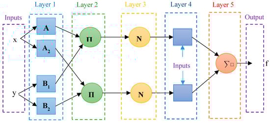 The ANFIS structure consists of five layers, as displayed in Figure 1. In each layer, the nodes are divided into two forms of adaptable and fixed. In this system, the nodes of layers 2, 3, and 5 (circular nodes) signify fixed nodes, and the nodes of layers 1 and 4 (square nodes), known as adaptive nodes, represent nodes in which parameters are capable to learn [52].