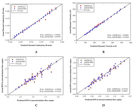 In order to perform further examinations, the regression diagram of the experimentally measured values versus the predicted values are displayed in Figure 3. As can be observed, the points are scattered around the fit line (the fit line represents the experimental data), indicating a great adjustment between the model output values and the actual values. It is easy to perceive that having a correlation coefficient close to one, the ANFIS-PSO model gives a minor error compared to the other model in predicting thermophysical properties.