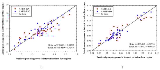 Regression plot for (A) thermal conductivity, (B) dynamic viscosity, (C) internal laminar flow, (D) internal turbulent flow, (E) internal laminar pumping power, and (F) internal turbulent pumping power prediction of Mg(OH)2-MWCNT-oil hybrid nanofluid.