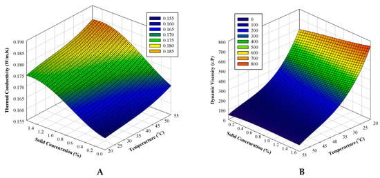 Finally, since the ANFIS-PSO model performed better than the ANFIS-GA model in predicting thermophysical properties, in the present study, this model is utilized as the preferred one to develop the thermophysical properties in different temperatures ranging from 20–50 °C and solid concentrations ranging from 0%–1.6%. Employing the well-trained ANFIS-PSO model, the input data set considered all the states of temperature and solid concentration with increments of 1 °C and 0.1 vol.% in the mentioned ranges, respectively. Regarding the capability of the proposed ANFIS-PSO model in accurate estimation of the thermophysical properties of Al2O3-MWCNT-oil hybrid nanofluid, the outputs of the ANFIS-PSO model regarding temperature and solid concentration are shown in a three-dimensional mesh plot (Figure 4). As can be seen, the ANFIS-PSO model produces a smooth surface that shows the high accuracy of the model. The values of the studied thermophysical properties in the defined temperature and solid concentration data set obtained from the ANFIS-PSO models are displayed in Figure 4.