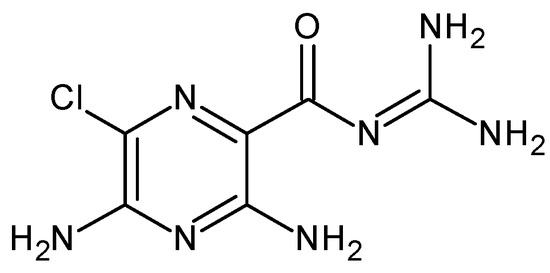 The chemical structure of amiloride (3,5-diamino-6-chloro-N-(diaminomethylene)pyrazine-2-carboxamide) is presented in Figure 1. It has a pKa of 8.7, LogP = −0.3, solubility = 1.22 g, and was used in this work as a model drug. It is an oral diuretic drug that promotes the retention of potassium by the organism and the reduction of sodium and chlorine by excretion and hypertension. It is often used as a booster for other diuretics and to combat congestive heart failure as it has a weaker action compared to thiazide diuretics [32,33,34,35].