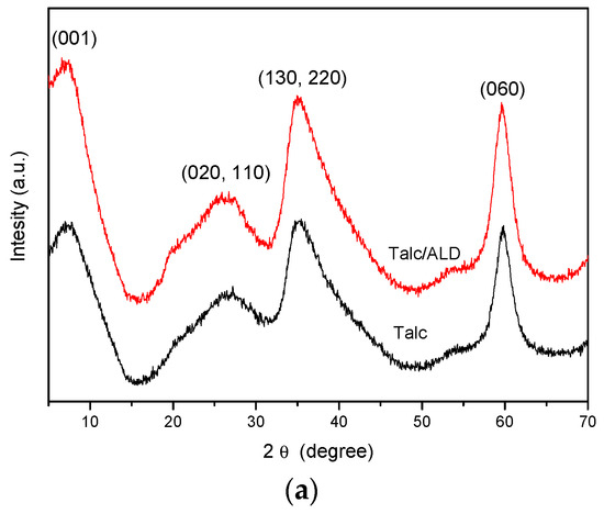 The results obtained from X-ray diffraction (XRD) are presented in Figure 3. In Figure 3a, it can be seen that the diffractogram representing the synthesized inorganic matrix (Talc) shows broad peaks defined at 7.2°, 26.3°, 35.1°, and 59.5°, identified as reflections in the crystalline planes (001), (020, 110), (130, 220), and (060), respectively. The peak representing the basal plane (001) corresponds to an interlamellar distance d001 equal to 1.23 nm. The reported lamella thickness for natural Talc is about 0.96 nm [39], thus, the interlamellar spacing obtained is approximately 0.27 nm. The maximum length estimated by the Chem Sketch 12.0 software (ACD/Labs, Toronto, ON, Canada) for ethoxy groups is about 0.16 nm, indicating that the remaining groups of incomplete TEOS hydrolysis may be within the basal space and/or on the Talc surface. The reflection related to the plan (060), observed at 2θ = 59.5°, corresponds to trioctahedral characteristics of type 2:1 phyllosilicates as in natural talc [51]. The presence of these characteristic peaks proves the efficiency of synthesis, indicating that the synthesized structure resembles the structure of natural Talc [37,52,53].