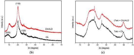 Comparing the diffractograms in Figure 3b, it can be observed that the peak at 8.7° displaced to 10.3° with increased intensity and narrowing, which can be attributed to interaction with ALD [54]. An increase in peak intensity by 20.1° (110) was also observed.