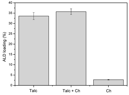 Thus, Talc and Talc + Ch are the most interesting materials in this work for use in the adsorption of ALD, since these adsorbed considerable amounts in relation the administration concentrations for this drug [61,62]. While the chitosan presented a low drug adsorption potential.