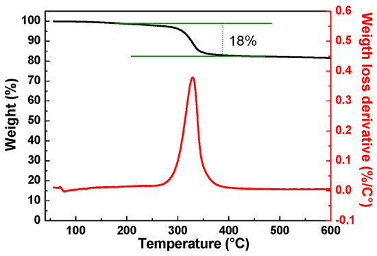 Thermo-gravimetric analysis and infrared spectroscopy were carried out to identify the composition and concentration of the lacquer. The TGA–thermogram of a dry Graphit 33 sample is shown in Figure 2. The sample is characterized by a weight loss in the 250–400 °C range, with a maximum degradation rate at ca. 330 °C, as can be seen from the derivative curve (red line in Figure 2). This weight loss could be attributed to the thermal degradation of the polymeric binder contained in the product, and it was estimated as ca. 18% by weight. As evidenced by the thermogram, the absence of weight loss at low temperature confirmed the absence of a volatile solvent after drying.