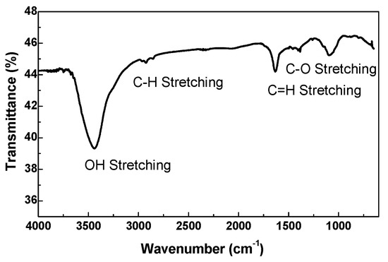 The FT–IR spectrum of the dry Graphit 33 in KBr is shown in Figure 3. The main absorption bands were centered at 3440 cm−1 (–OH group stretching), 2927 cm−1 (C–H group stretching), 1631 cm−1 (C=C group stretching), and 1092 cm−1 (C–O group stretching).