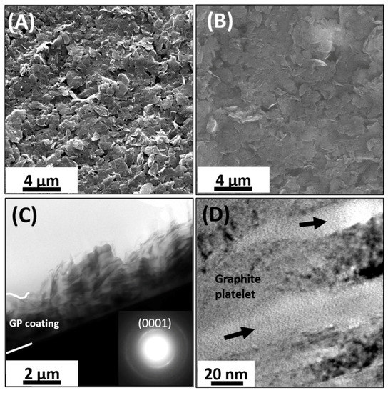 By increasing the magnification (Figure 5D), it is possible to observe that coating is made of overlapping graphite platelets of different thickness, ranging from tens to hundreds of graphene layers. Among the platelets, the polymeric binder visibly generates a lighter contrast typical of amorphous material (see arrows). Although, the platelets assume all orientations locally in the selected area electron diffraction (SAED) pattern of a large part of the coating (shown in the inset of Figure 5C) it could be observed that the ring corresponding to the (0001) atomic planes had a non-uniform intensity that could be correlated to the platelet’s tendency to align, in average, parallel to the interfacial plain.