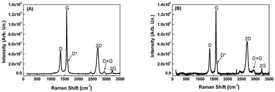 Further structural characterizations were performed by Raman spectroscopy. The following spectra are related to GP films deposited on glass (Figure 6A) and LDPE (Figure 6B).