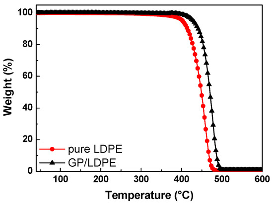 The thermal stability of the pure LDPE and LDPE coated by GP was evaluated by TGA measurements. According to the TGA–thermograms, up to a temperature of ca. 130 °C, both samples were stable since they did not show any weight loss. Furthermore, by comparing the residual mass at 600 °C, which had TGA curves in the 40–600 °C range, it could be seen that the average amount of coating was ca. 1% by weight of the full LDPE/GP system. The graphite coating had the effect of increasing the pure LDPE substrate thermal stability by ca. 22 °C (see Figure 7).