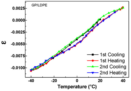 Strain, ε, vs. temperature of the LDPE coated by GP for two consecutive cooling–heating cycles.