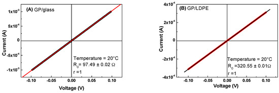 All electrical measurements were carried out under vacuum in two probe configuration. The I–V characteristics of the GP films deposited on glass and LDPE were linear, indicating ohmic contacts, as shown in Figure 9.