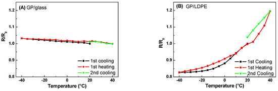 R/R0 vs. temperature during the cooling–heating cycles for GP films deposited on glass (A) and LDPE (B) substrates.
