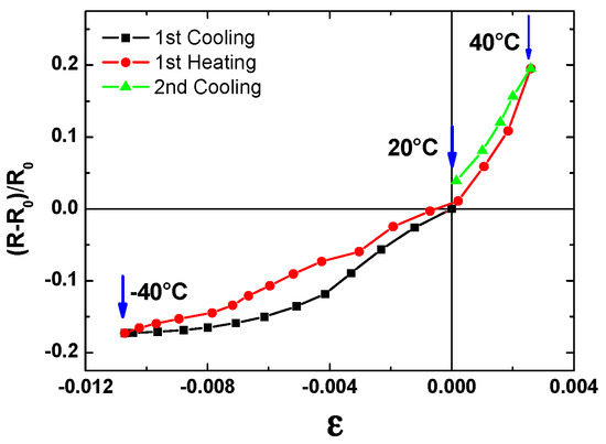 In order to correlate the effects of the thermal expansion of the LDPE substrate with the electrical properties of graphite platelet films, tests of thermal expansion and contraction were carried out on a sample of LDPE coated by GP. In particular, this characterization was carried out between −40 °C and 40 °C, because in this temperature range, LDPE did not show any phase transition such as crystallisation, melting, or glass transition, and the stress–strain response induced by temperature variations was quite reversible [28].