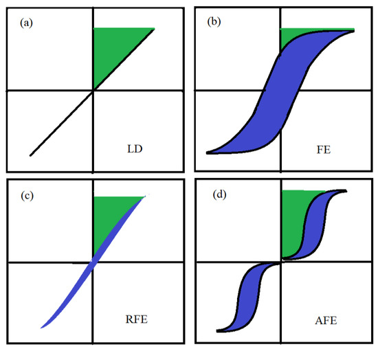 Hysteresis and corresponding energy storage density for (a) linear dielectrics, (b) ferroelectrics, (c) relaxor ferroelectrics, and (d) antiferroelectrics. The green area represents energy density and the blue area refers to the energy loss.