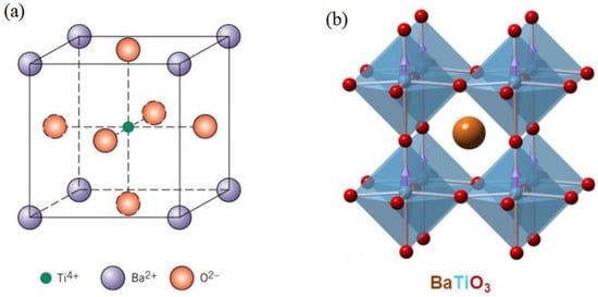 The BT-based ceramic system with an ABO3 perovskite structure (A is calcium, strontium, barium, etc., and B is tantalum, titanium, etc.) [24], has advantages of low dielectric loss and stable electrical properties for operations of long durations, but their use is limited due to low Tc and d33 even at room temperature [25]. BaTiO3 is the first reported lead-free piezoelectric ceramic and an important ferroelectric material used in many processes and applications in electronics, due to its typical perovskite structure and specific characteristics, such as a high dielectric, ferroelectric, and piezoelectric properties. Figure 2 describes the unit cell and crystal structure of BaTiO3.