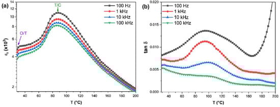 Temperature-dependence of the (a) dielectric constant and (b) dielectric loss of Ba(1−x)CaxZryTi(1−y)O3 (BCZT) ceramic at different frequencies. O/T corresponds to orthorhombic–tetragonal transition and T/C denotes the tetragonal–cubic phase transition. Reprinted with permission from [55]. Copyright 2019 Springer Nature.