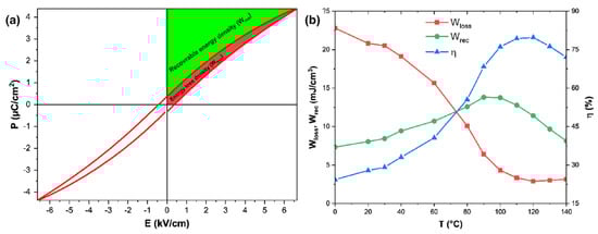They found that as the temperature increased, the P–E loops had become slimmer and there was a continuous decrease of Pr, Ec, and Pmax [55]. The Wrec (green area of Figure 5a) increased gradually with temperature and reached a maximum of ~14 mJ/cm3 at 90 °C and then decreased.