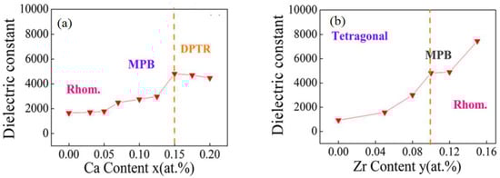 Jiagang Wu et al. reported that the increase of sintering temperature causes the relative density and average grain size of BCZT to gradually increase, and electrical properties are also enhanced. They showed that the value of BCTZ ceramics increased and the tanδ decreased with an increase of sintering temperature [56]. The Ca and Zr contents also matter a lot regarding dielectric properties as described by Ye Tian et al. They found that that the increased with the increase in Ca content and the highest value of (= 4821) was found at x = 0.15. The increases significantly at y = 0.10 and reaches maximum at y = 0.15, as shown in Figure 6 [57]. It can be seen from Figure 6a that by increasing the Ca contents, the material at morphotropic phase boundary (MBP) region, entered to diffuse ferroelectric phase transition region (DPTR) while this region was not achieved by changing Zr concentration.