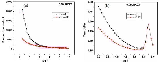 (a) Variation of ε as a function of logf for 0.20LBCZT Heterostructure. (b) Variation of tanδ as a function of logf for 0.20LBCZT with and without applied magnetic field (H). Reprinted with permission from [51]. Copyright 2016 Springer Nature.