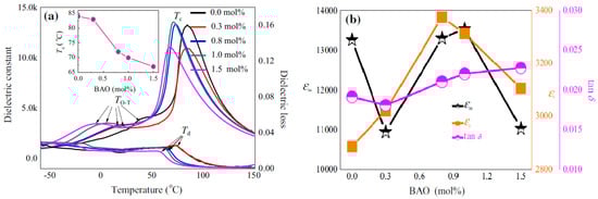 The temperature dependence of εr and TC for (1−x)BCZT–xBAO ceramics measured at 1 kHz (a). The maximum dielectric constant (εm), dielectric constant (εr), and dielectric loss (tanδ) of BCZT ceramics with different BAO contents (b). Reprinted with permission from [76]. Copyright 2015 Springer Nature.
