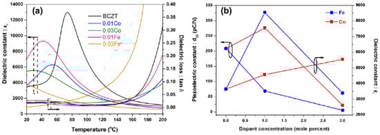 Dielectric and piezoelectric properties of BCZT-xCo and BCZT-xFe ceramics. Dielectric versus temperature at 1 kHz (a) and piezoelectric constant as a function of dopant concentration (b). Reprinted with permission from [71]. Copyright 2018 WILEY-VCH Verlag GmbH & Co.