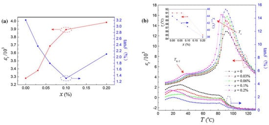(a) Dielectric properties as a function of x at 1 k Hz and (b) temperature dependence of the εr and tanδ of BCZT-xSb ceramics. Reprinted with permission from [78]. Copyright 2011 Springer Nature.