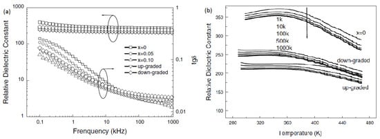 The dielectric constant and dielectric loss of the homogenous and compositionally graded BCZT thin films as functions of frequency, measured at room temperature (a). The dielectric constant of Ba1−xCaxZr0.05Ti0.95O3 (x = 0) and compositionally graded BCZT thin films as a function of temperature (b). Reprinted with permission from [87]. Copyright 2008 Springer Nature.