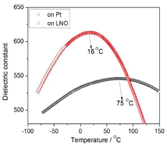 Dielectric constant as a function of temperature measured at frequency of 100 kHz for the BCZT thin films deposited on Pt(111)/Ti/SiO2/Si substrate and LNO/Pt(111)/Ti/SiO2/Si substrate. Reprinted with permission from [60]. Copyright 2013 Elsevier.