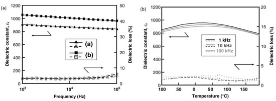 Dielectric constant and loss of (Ba,Ca)(Zr,Ti)O3 thin films on Pt/TiOx/ SiO2/Si substrates crystallized at 700 °C as a function of the measured frequency, (a) Ba:Ca = 1.0:0.0 (▲, △) and (b) Ba:Ca = 0.95:0.05 (■, □) [Zr:Ti = 0.20:0.80] (a). Temperature dependence of dielectric constant and loss of (Ba,Ca)(Zr,Ti)O3 thin film on Pt/TiOx/SiO2/Si substrate crystallized at 700 °C (measured frequency: 1–100 kHz) [Ba:Ca = 0.95:0.05, Zr:Ti = 0.20:0.80] (b). Reprinted with permission from [90]. Copyright 2008 Elsevier.