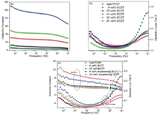 Frequency dependence of the dielectric constant (a) and the dielectric loss tangent, (b) of dopamine@BCZT/PVDF composite films, and (c) BCZT/PVDF (Poly(vinylidiene fluoride) composite films. Reprinted with permission from [54]. Copyright 2012 Royal Society of Chemistry.