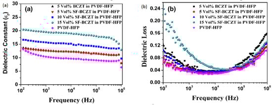 Dielectric constant versus frequency (a), dielectric loss versus frequency (b) for different molar concentration of PVDF-HFP in BCZT. Reprinted with permission from [61]. Copyright 2018 Springer Nature.