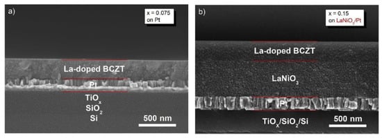 Cross-sectional SEM images of La-doped BCZT thin films at x = 0.0075 and 0.15. (a) On Pt bottom electrodes, and (b) on LaNiO3/Pt composite bottom electrodes. Reprinted with permission from [62]. Copyright 2019 Elsevier.